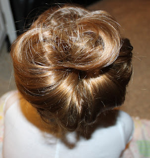 Now I take the hair that is looped and pull it upwards towards her head.  This makes a circle shape in her hair secure this with a clear small elastic.